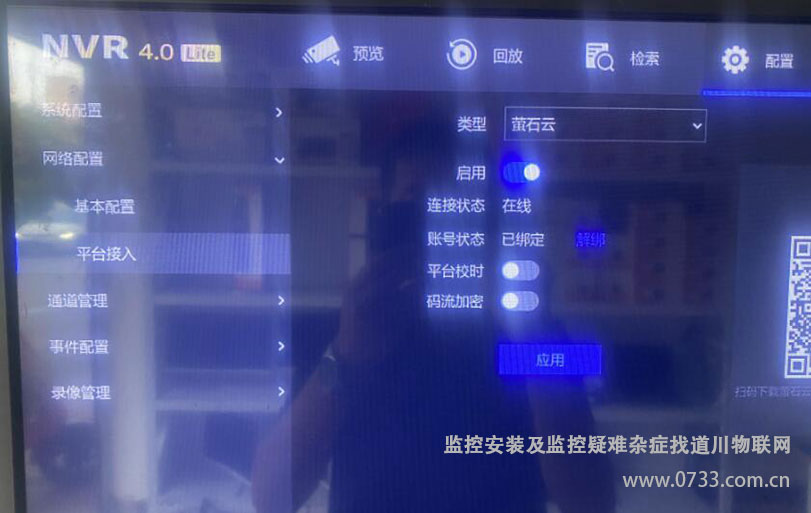 新版本的固件升级成功后,把录像机与显示器连接,会显示新版的登陆页面和界面风格,然后点击配置-网络配置-平台接入,会发现萤石云的账号状态出现了解绑按钮,解绑后,点击应用。然后修改右边二维码上面的验证码。使用手机萤石云APP重新扫描即可绑定成功。
